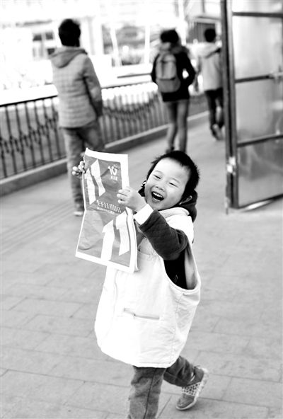 清晨的中關村大街人來人往,新京報攝影記者浦峰肩披“新京報創刊十周年”紅色綬帶,把黃色工服穿在了兒子浦暄晨的身上。手拿報紙,父子倆開始吆喝起來,4歲半的小報童喊著:“賣報,賣報,一元錢一份!”