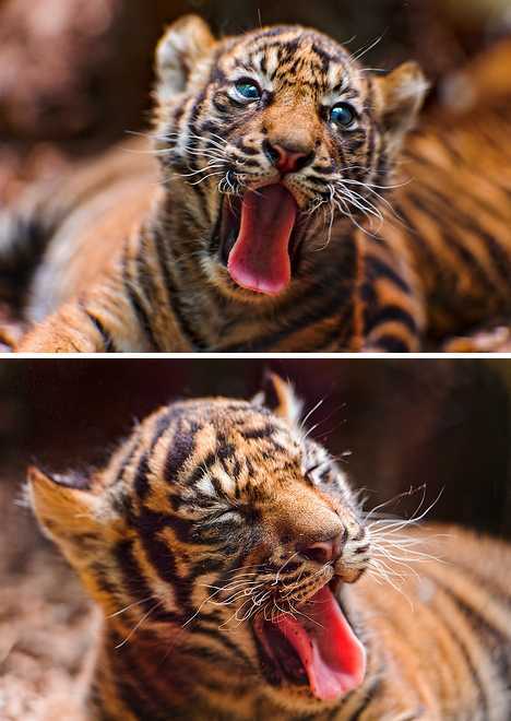小老虎长得很快。这只老虎幼崽看来是困乏了,它张开嘴巴,不过现在的它还不能构成什么威胁,反而非常可爱。