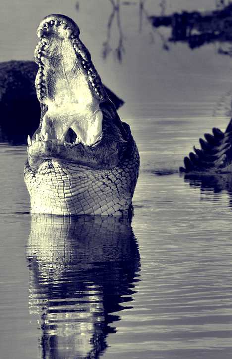 一只露出水面的巨型鳄鱼张开大嘴,似乎是在打哈欠