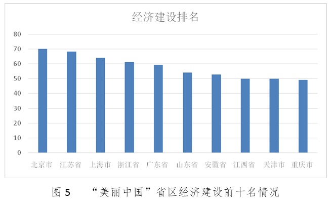 经济建设指标各省市得分具有较大差距,北京市、江苏省、上海市、浙江省处于“领跑”区,其中,北京市、江苏省、上海市、浙江省得分超过60分。其余省区得分较低,说明各省区的经济生态化建设,尤其是经济转型、地区可持续发展方面仍有待提高。