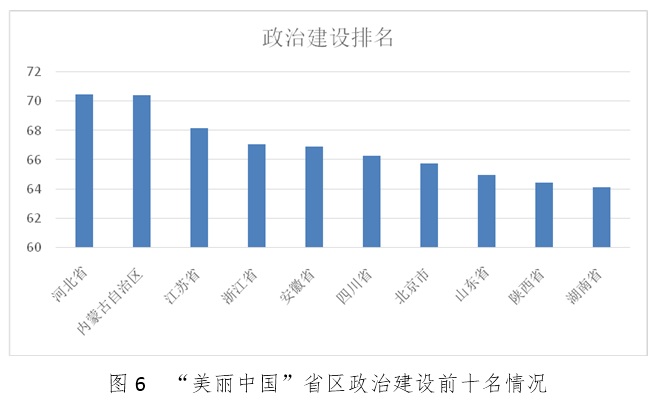 政治建设指标前十名的省区得分较高,部分省区制定了生态文明建设规划,及时公布环境信息,制定了干部离任“生态审计”制度。在未来发展过程中省区还需要进一步改进和完善政治建设,更好地实现绿色执政,推进社会公平正义。