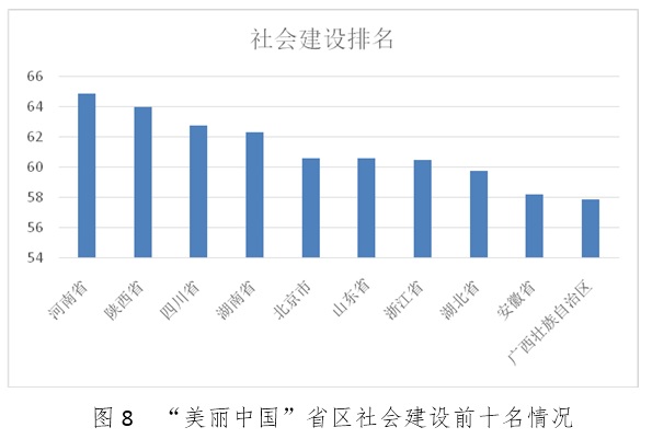 社会建设指标整体水平较低,说明各省区在推进“美好生活”建设方面还需要进一步加强。社会指标排名前十的地区依次为河南省、陕西省、四川省、湖南省、北京市、山东省、浙江省、湖北省、安徽省、广西壮族自治区。