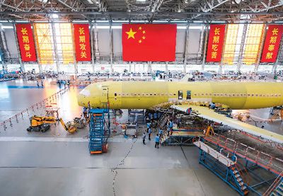 工人们在中国商飞上海飞机制造有限公司C919总装生产线进行装配。 新华社记者 沈伯韩摄